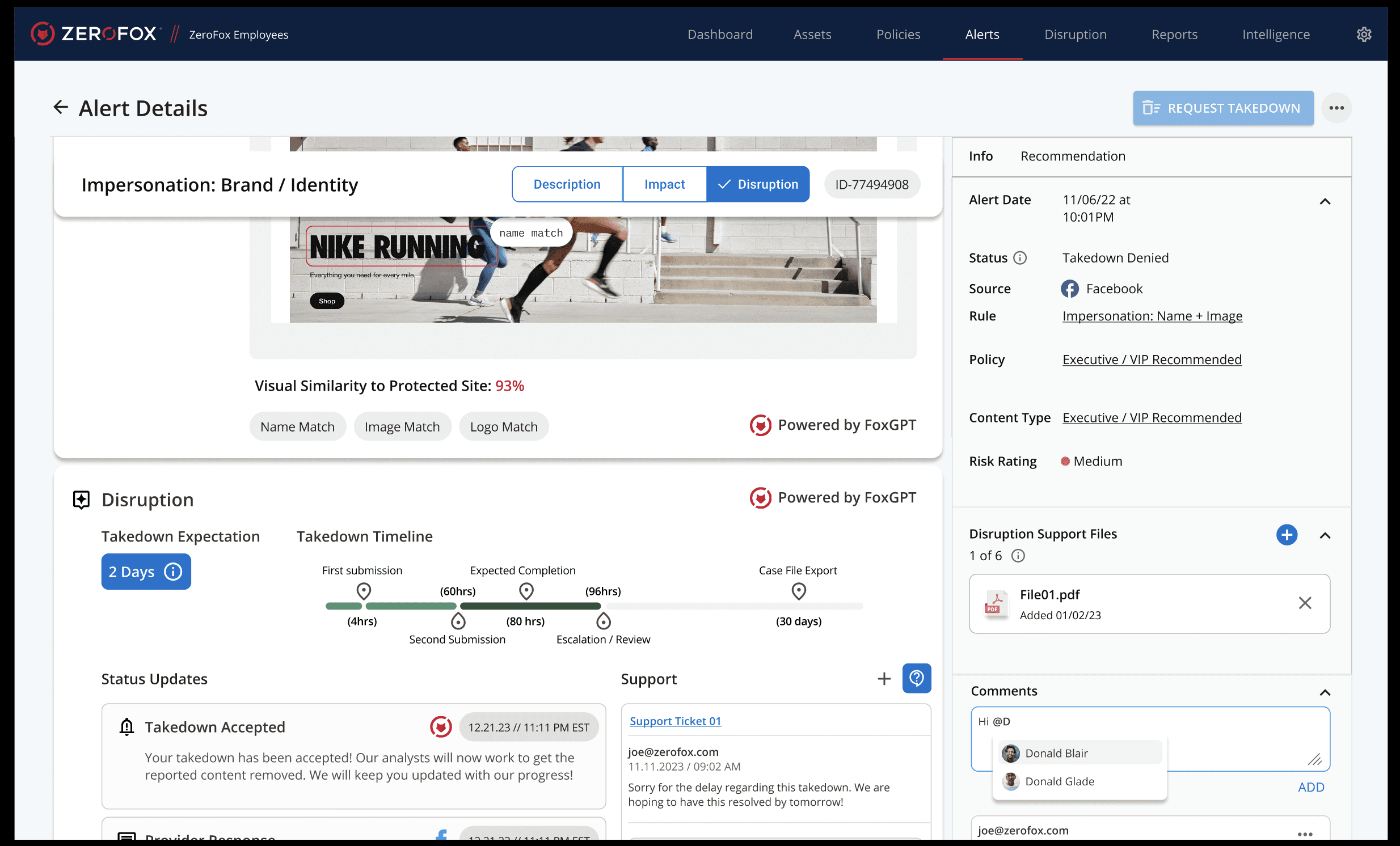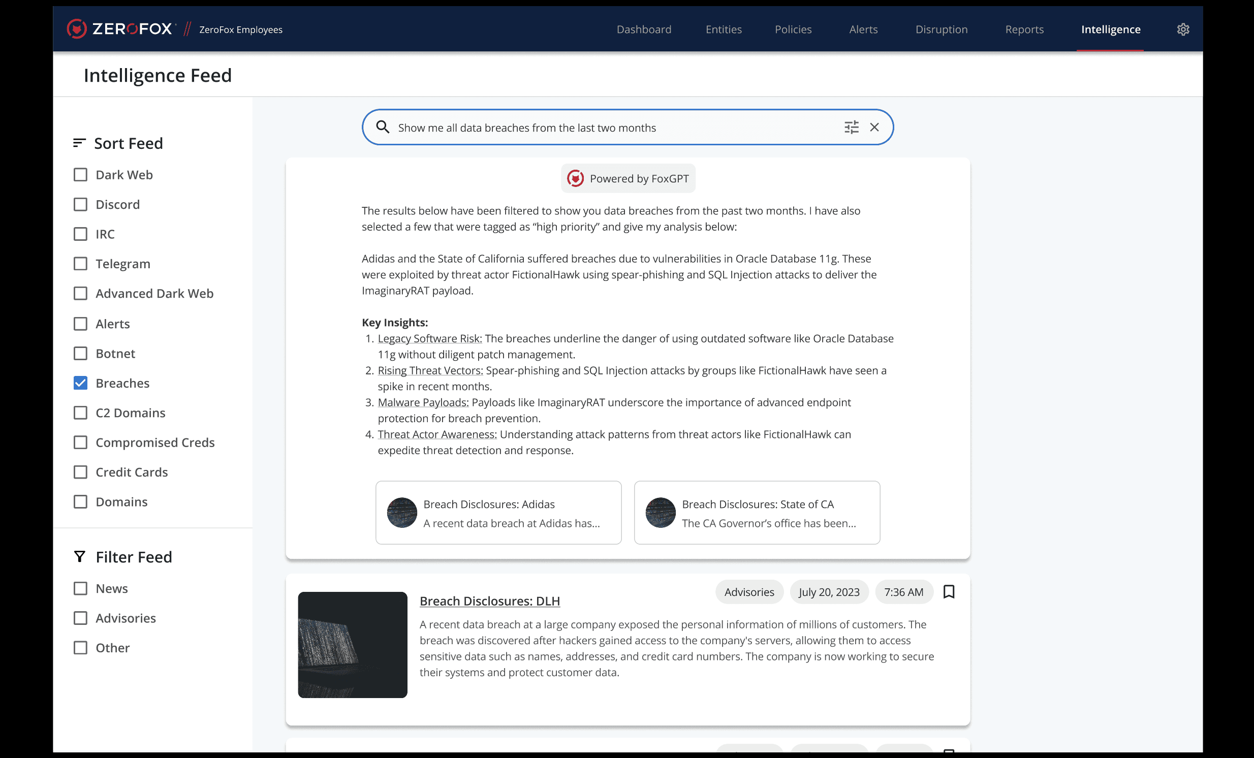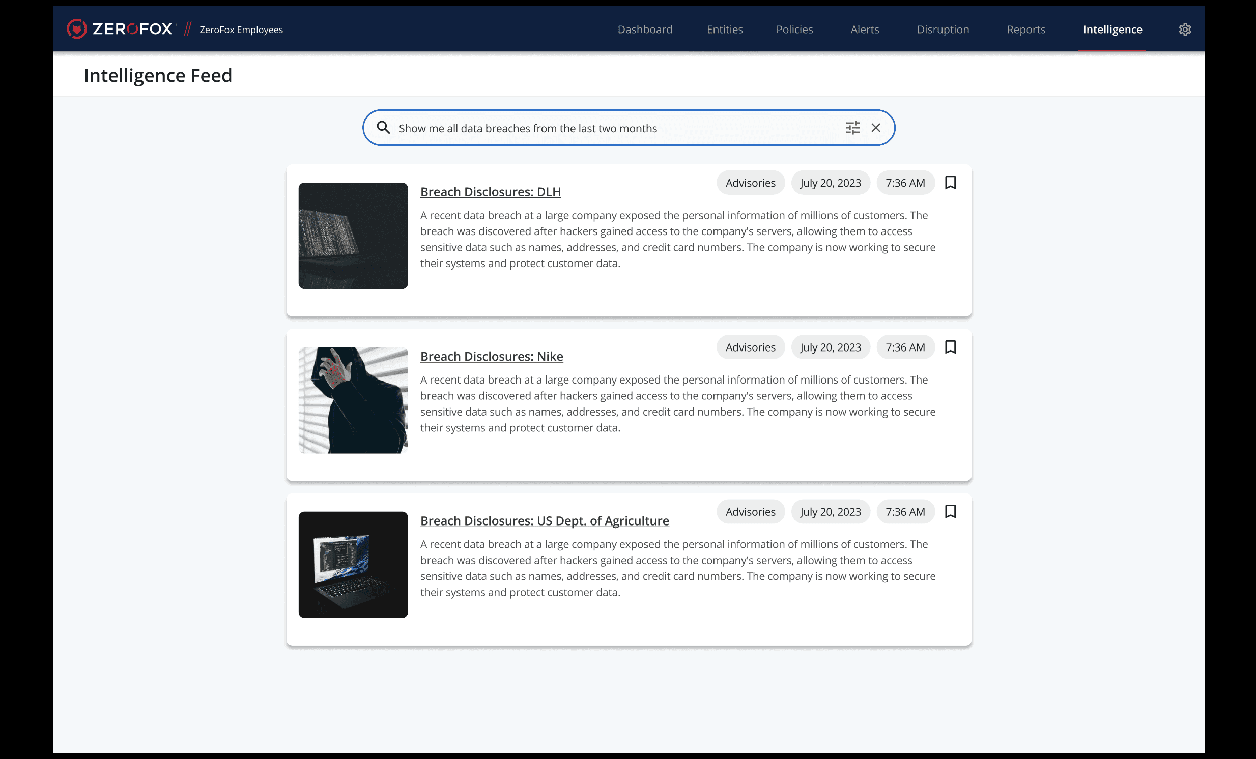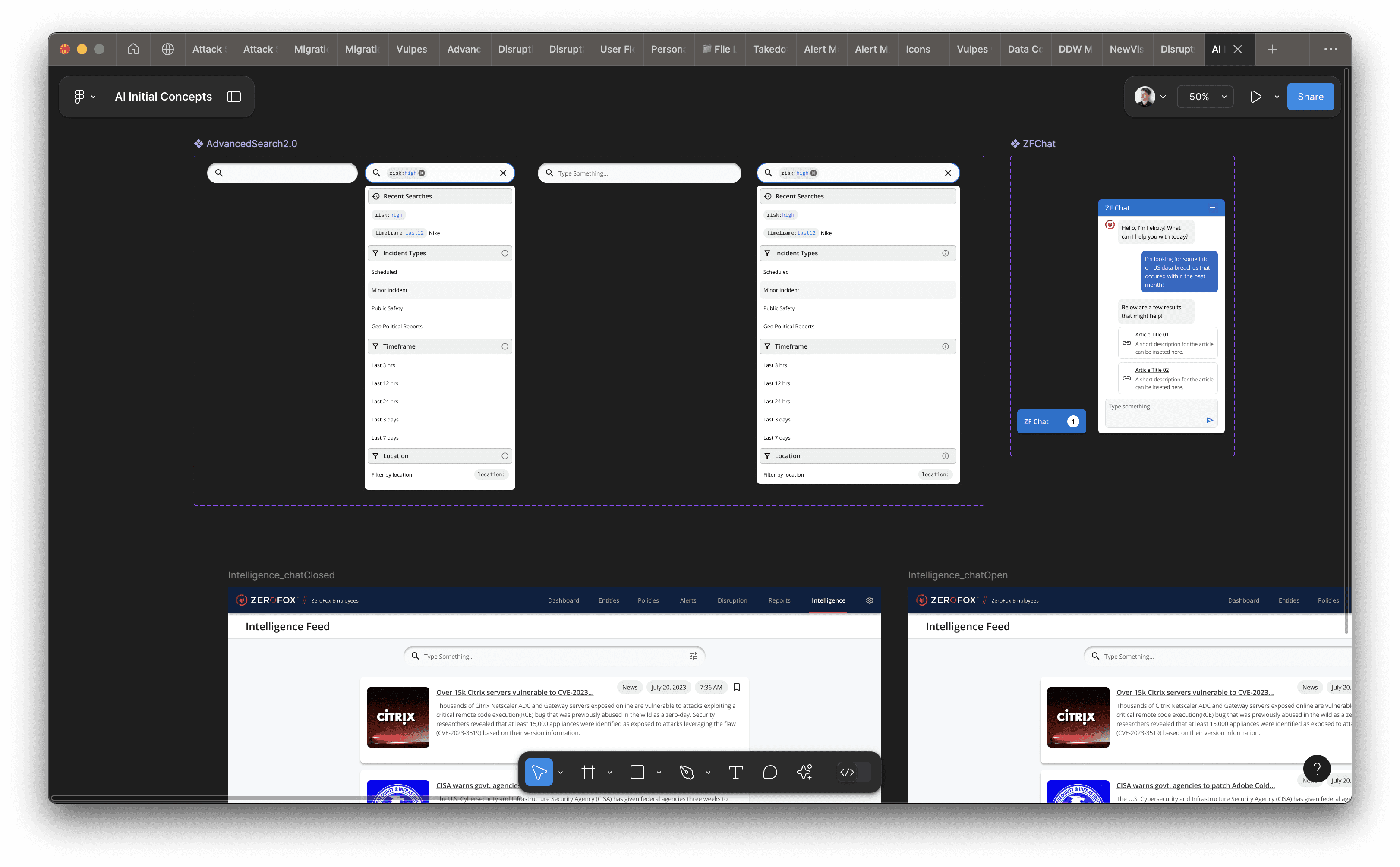 I was tasked by the AI team at ZeroFox to help them conceptualize new use cases for AI within the platform. I also incorporated an "Advanced Search" input into these designs that would later be used in other places on the platform (mainly "Intel Search").